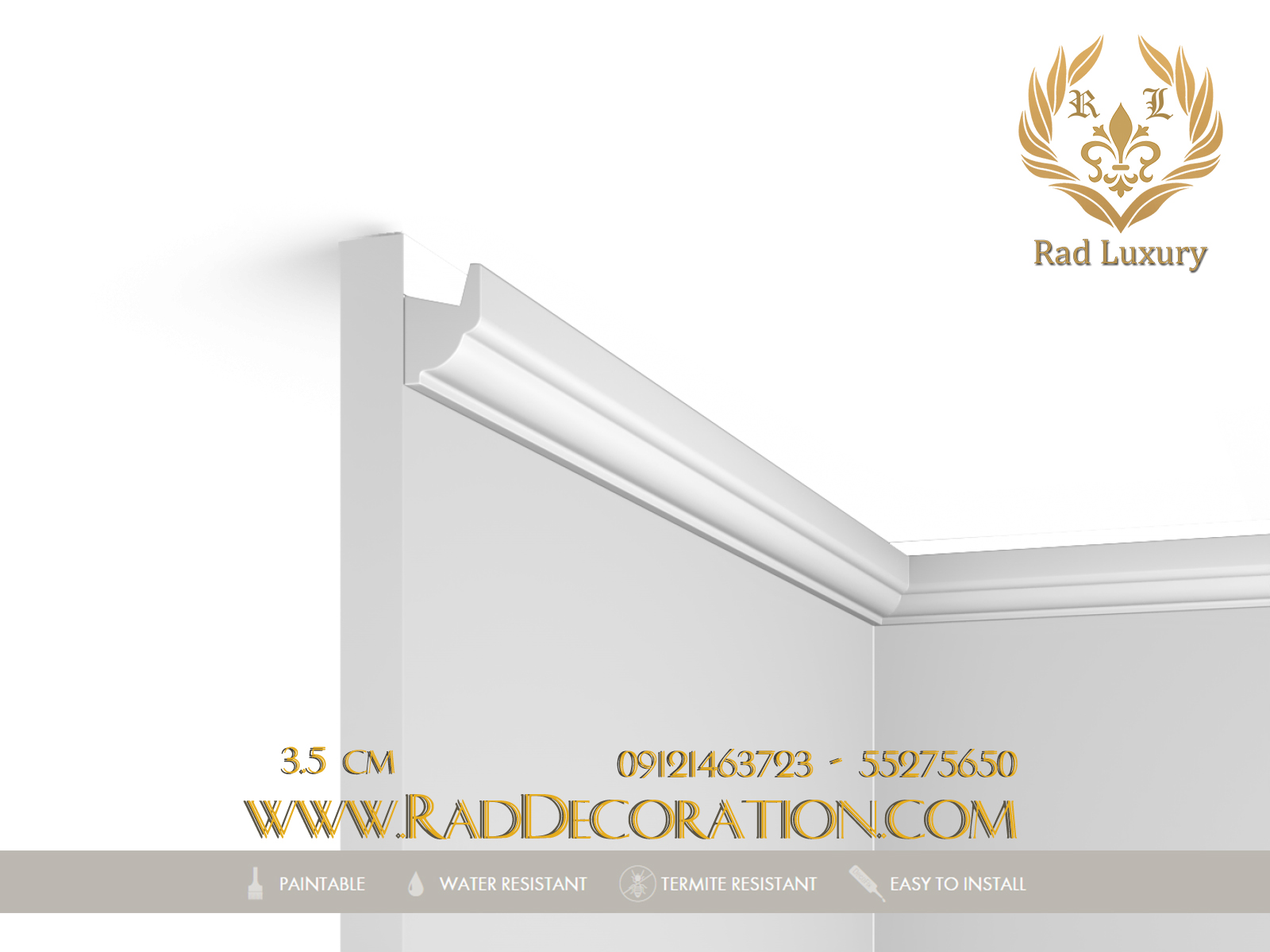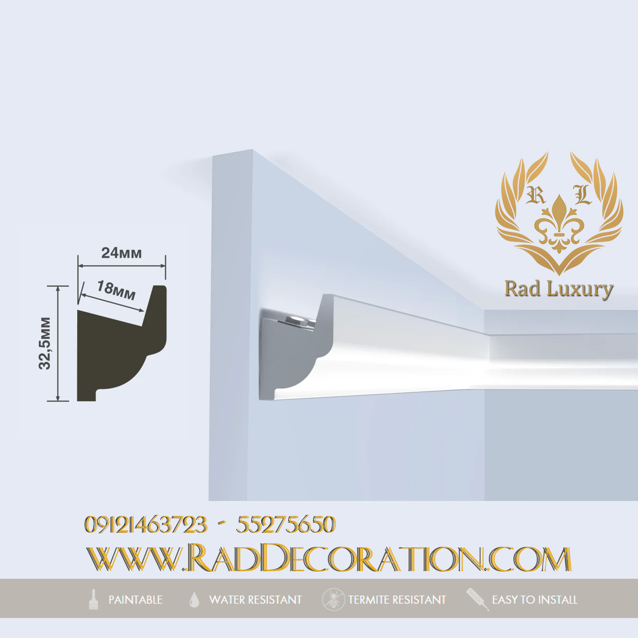 Rounded compact design profile for indirect LED lighting. The subtle shadow line adds to the lighting’s ambience. Designed by Orio Tonini. Installation remark: use an aluminum tape on the inside of the profile, or an aluminum LED support to avoid the light showing through the moulding